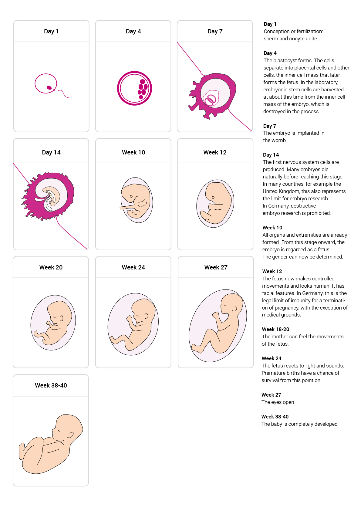 Successful implantation is the prerequisite for embryonic development. Implantation takes place about six days after fertilization. From implantation on, the embryo must be treated with the necessary respect, namely humanely. In nature, it often happens that the fertilized egg is not successfully implanted in the uterus but is rejected. We therefore have no knowledge of these embryos. In fertility treatment (in vitro fertilization), this stage is only an accumulation of cells in an artificial environment.